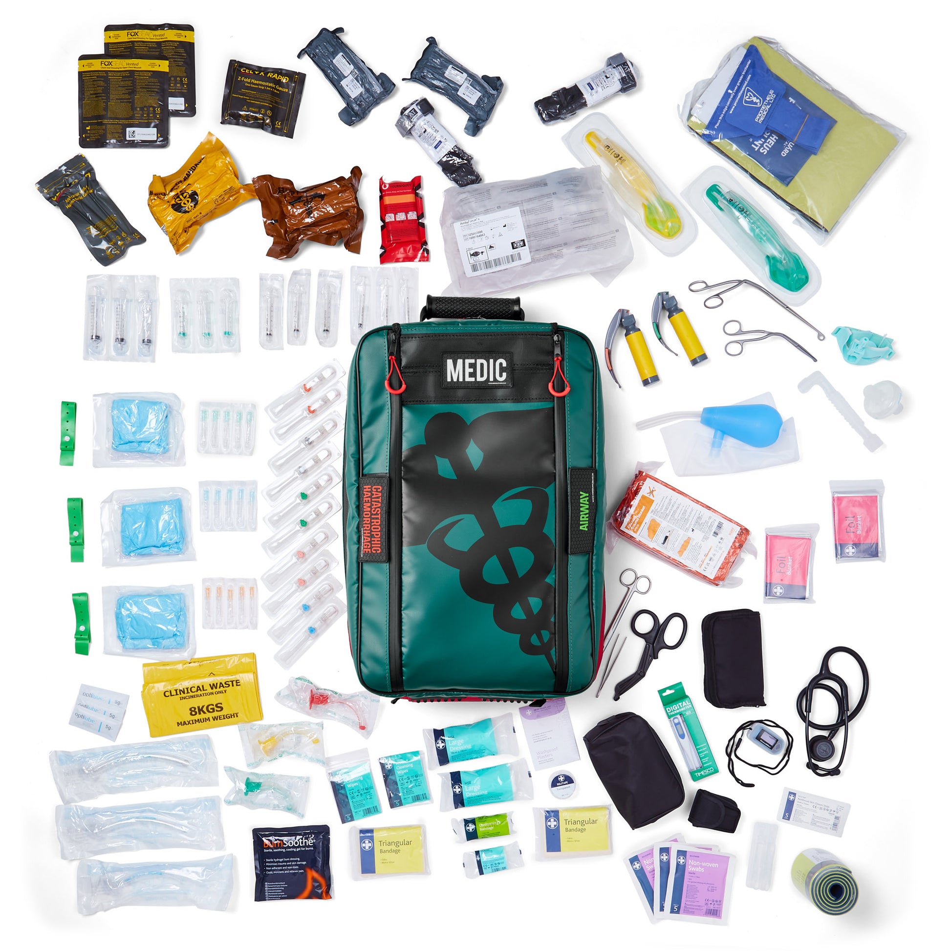 - 11x MERE Patches (2x Catastrophic Haemorrhage, 2x Airway, Breathing, Circulation, Diagnostic, Minor Injuries, Hypothermia, Medication, Paramedic)